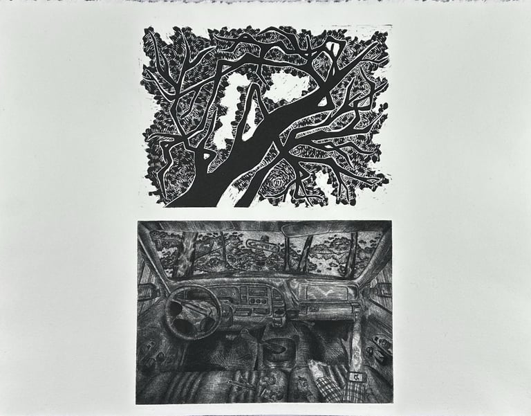 "Sinking Ship", Ink on Paper, in x in, Fall 2025, ART 2400 Introduction to Printmaking