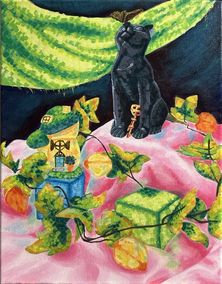 "Cat Village", Acrylic Paint on Canvas, 14 in x 11 in, Fall 2025, ART 2150 Introduction to Painting